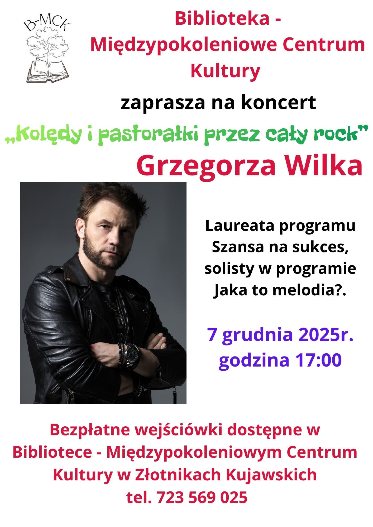 Biblioteka – Międzypokoleniowe Centrum Kultury w Złotnikach Kujawskich zaprasza na wyjątkowy koncert świąteczny Grzegorza Wilka pt. „Kolędy i pastorałki przez cały rock”, który odbędzie się w niedzielę, 7 grudnia 2025 roku o godzinie 17:00.